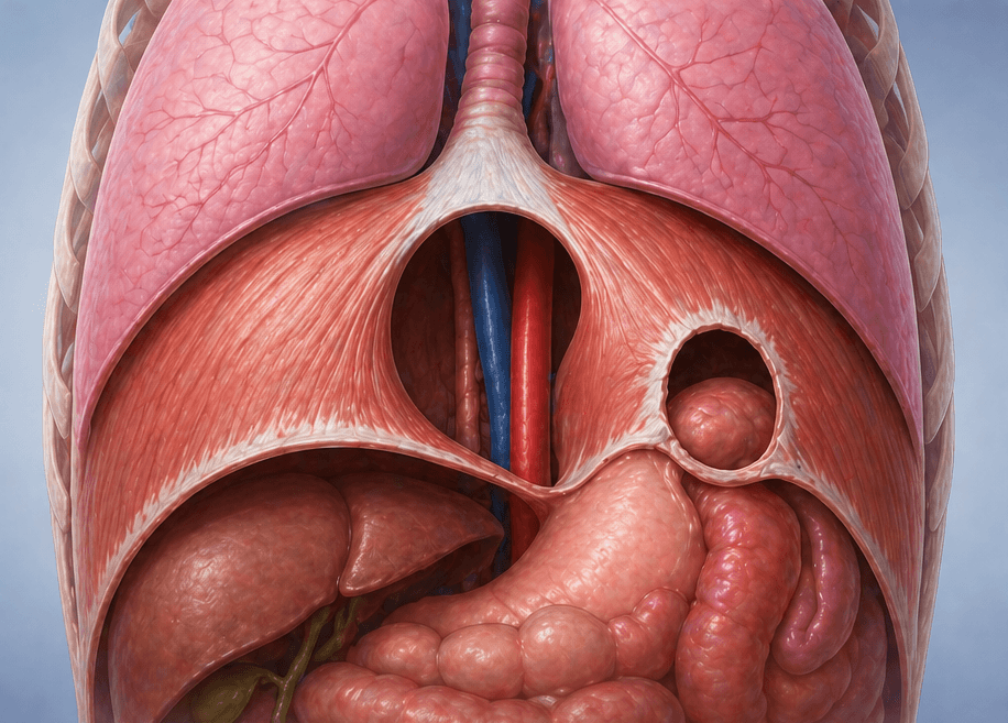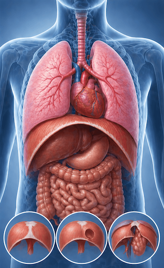 The diaphragm, the dome-shaped muscular sheet separating the chest from the abdomen, is essential for breathing and plays a critical role in thoracic and abdominal surgery. Diaphragmatic disorders range from congenital defects and traumatic ruptures to hernias and tumours, each presenting unique diagnostic and surgical challenges.